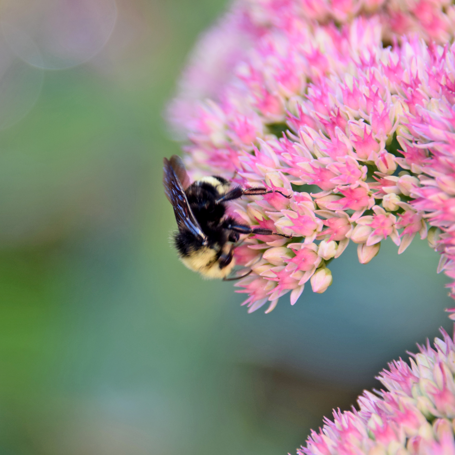 I absolutely adore these next two photos. There was a very busy bumble bee working on some truly lovely pink flowers. The combination along with some amazing depth in the macro photography created a very artistic look, in my opinion. Thanks bumblee!